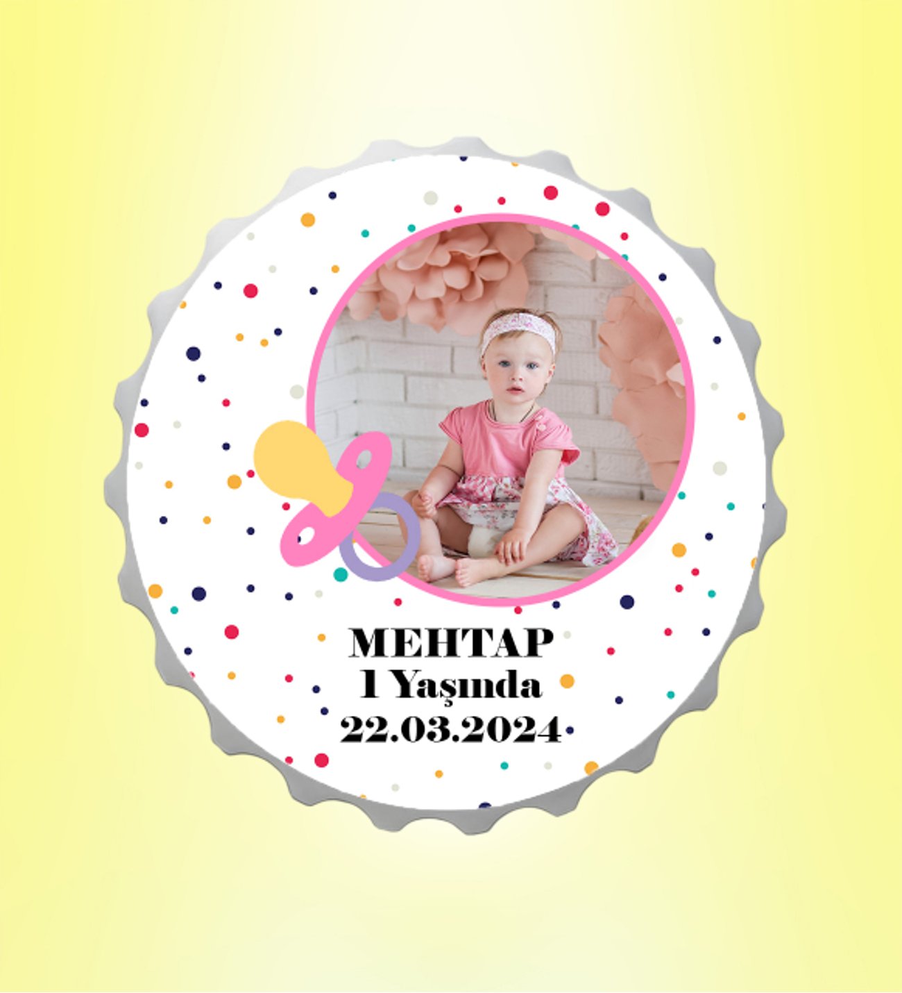 Kız Bebek Resimli İsimli Puantiyeli Emzikli Kapak Magnet Açacak Kişiye Özel