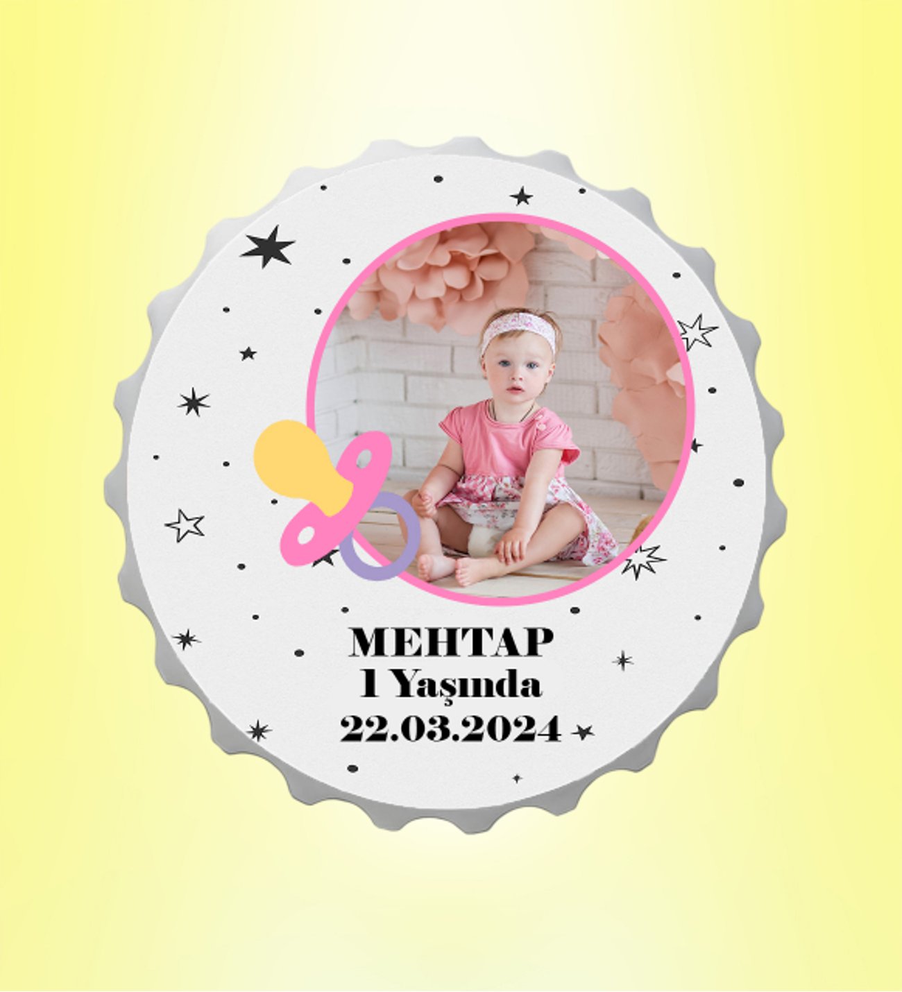 Kız Bebek Resimli İsimli Yıldız Emzikli Kapak Magnet Açacak Kişiye Özel